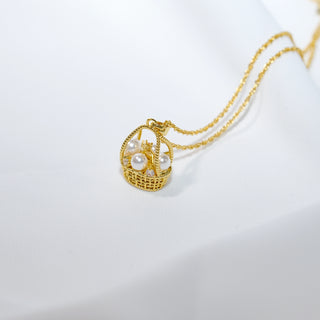 Gold Plated Pearl Basket Necklace – Elegant 3D Woven Pendant with Cubic Zirconia