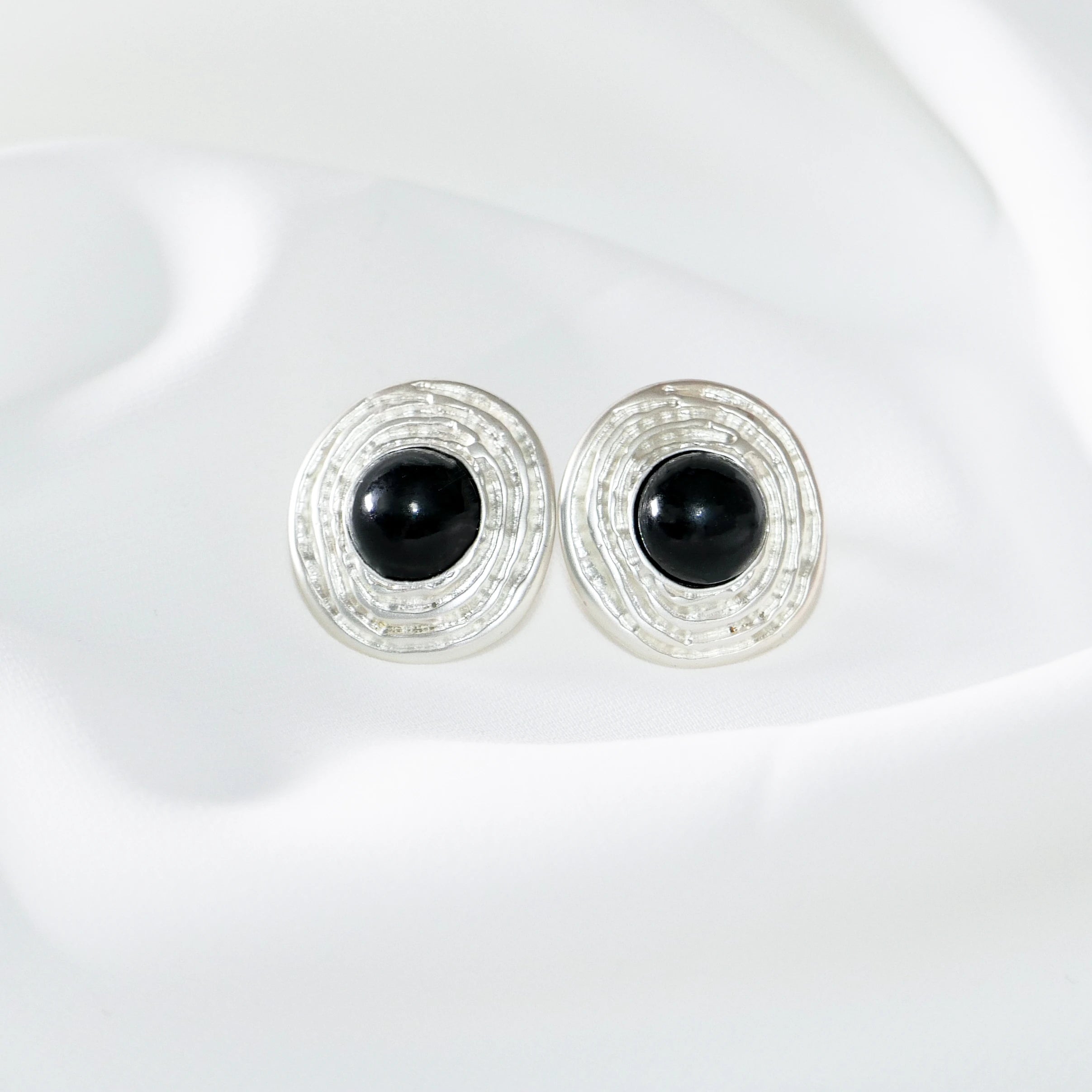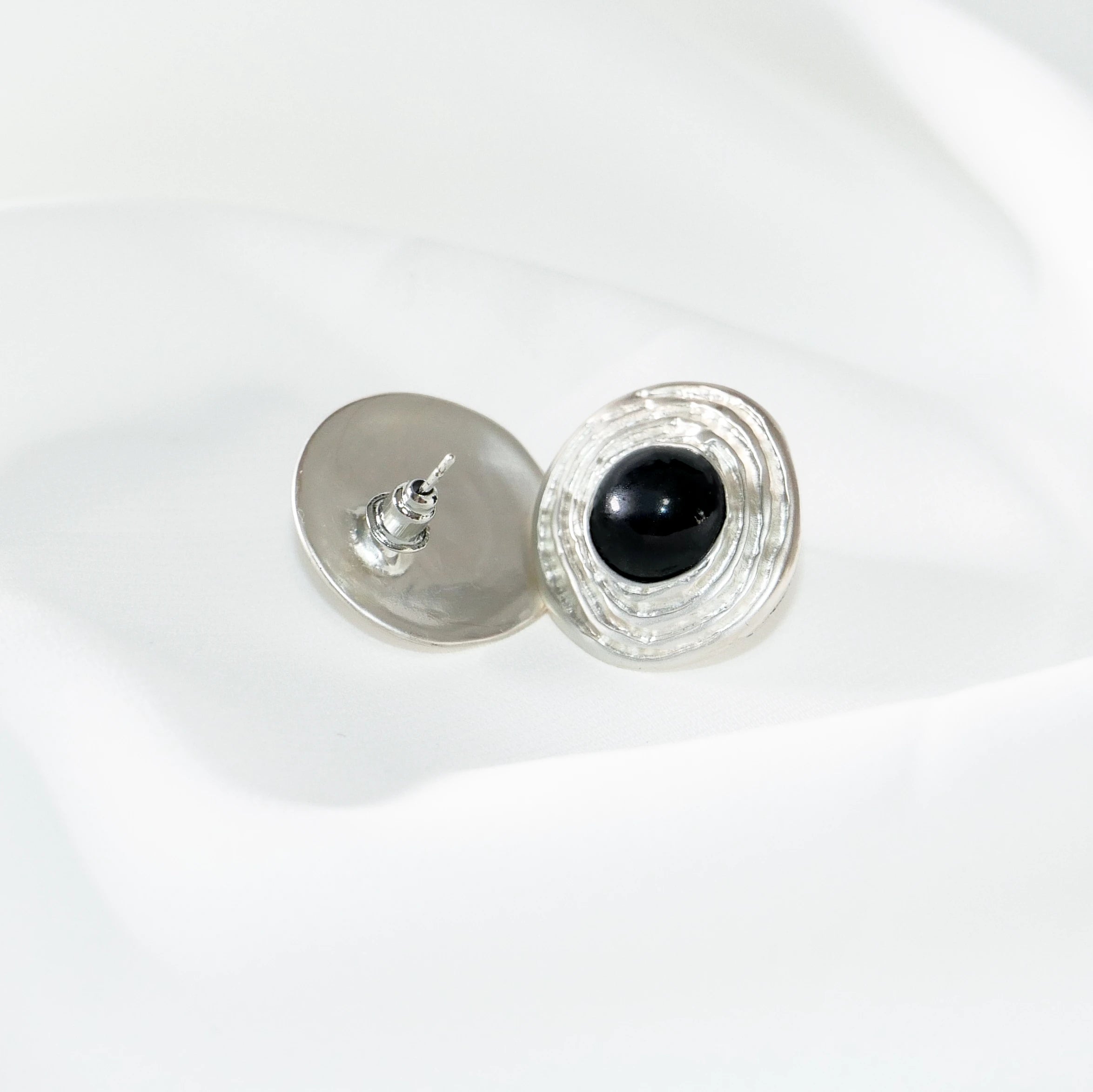 Black Onyx S925 Silver Stud Earrings – Handcrafted Textured Circle Design