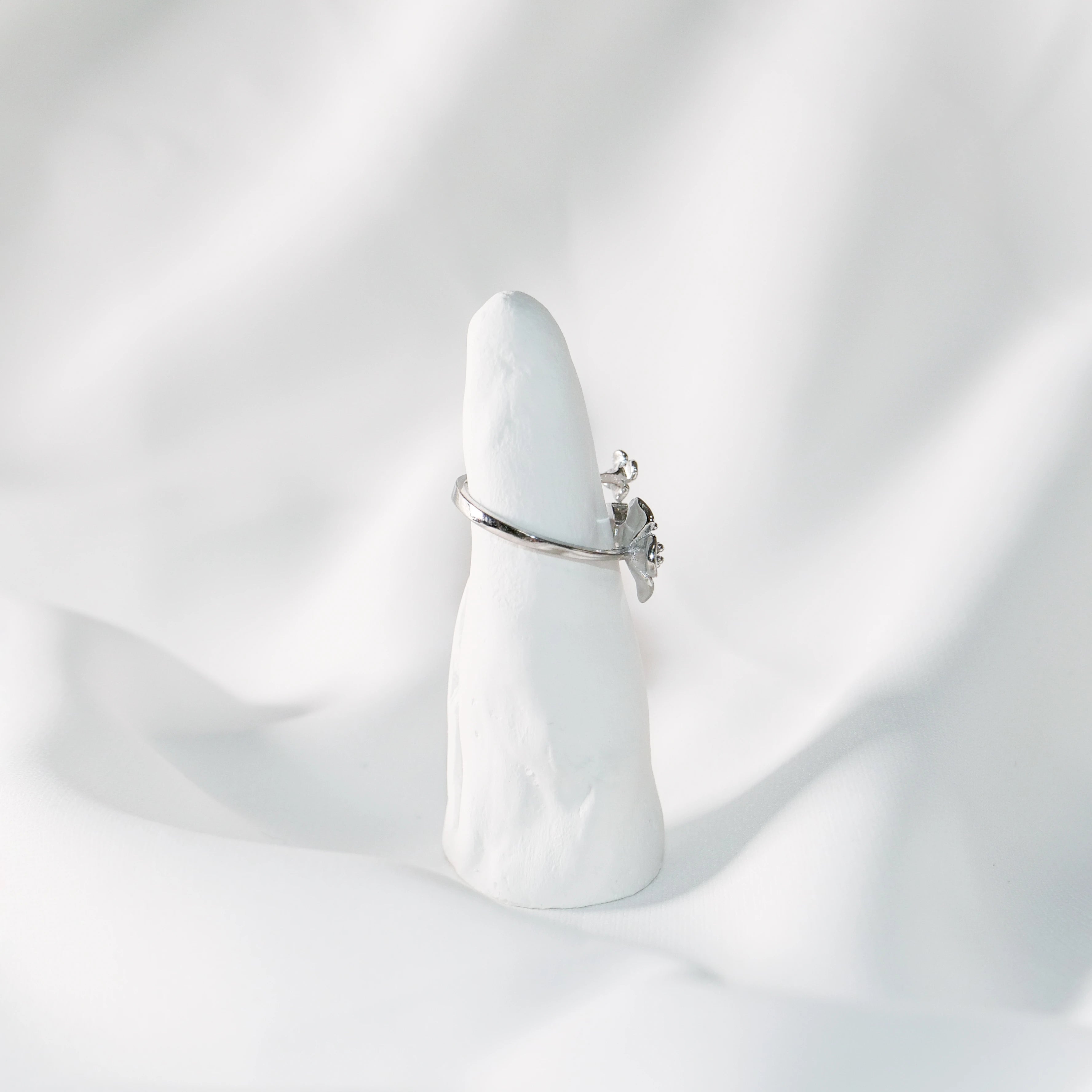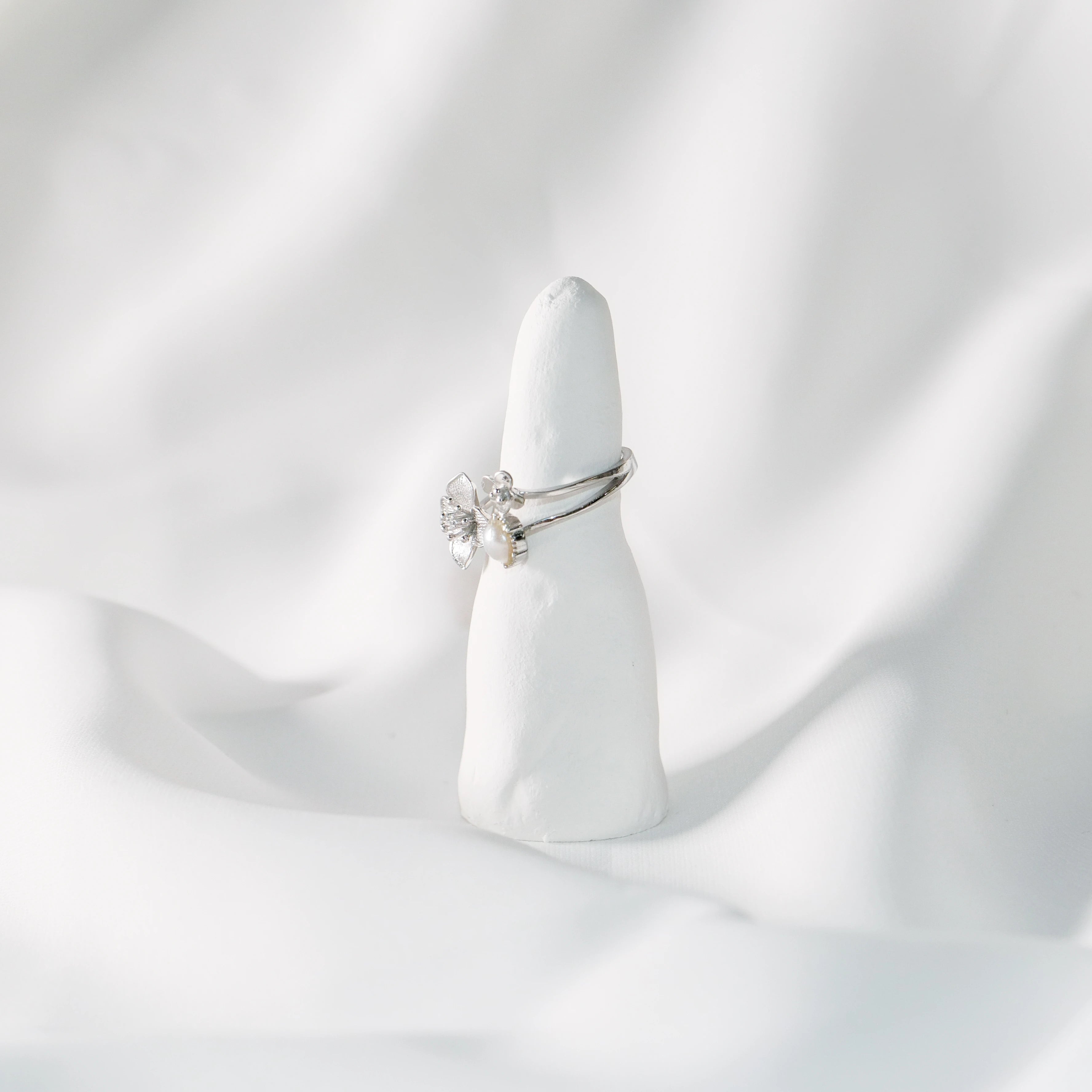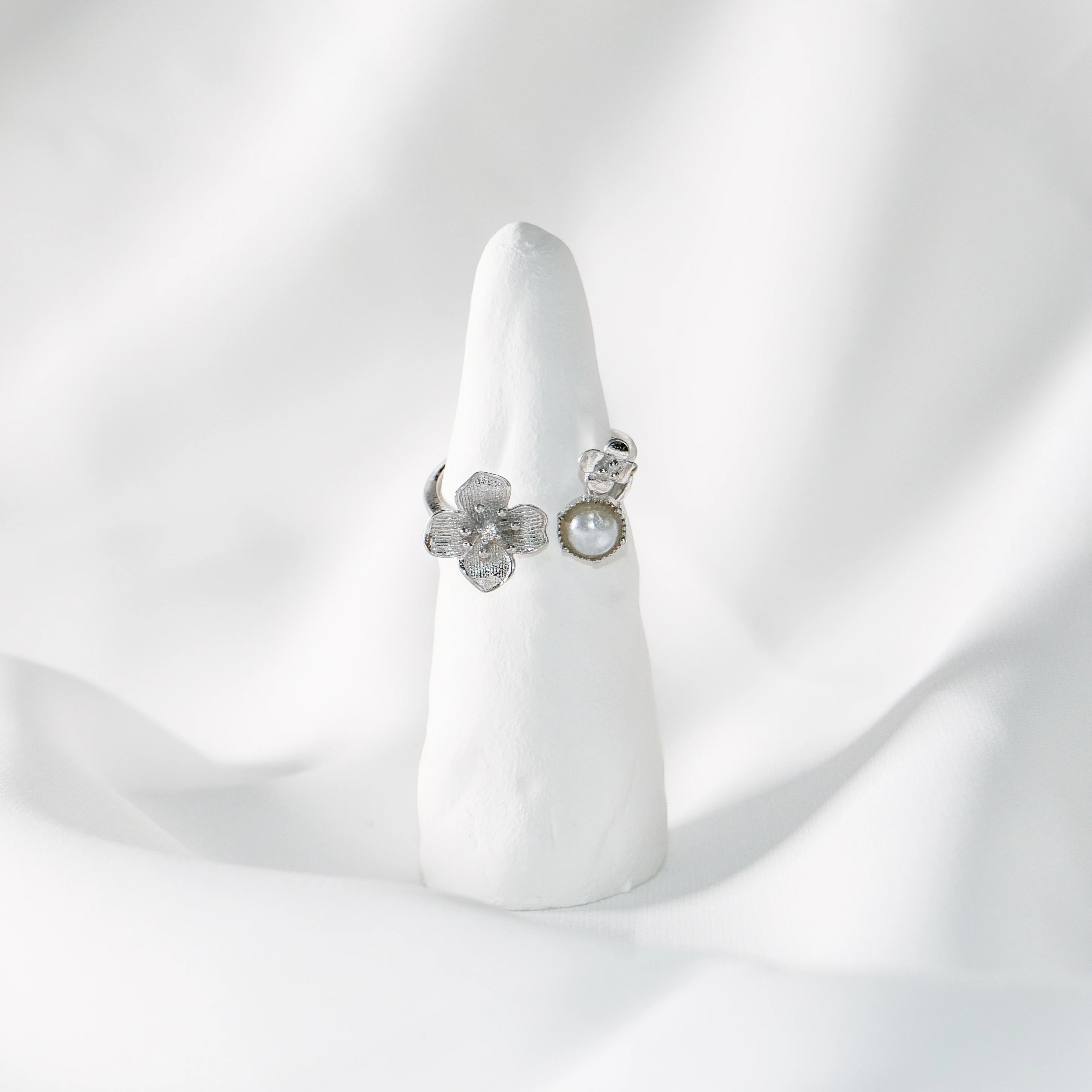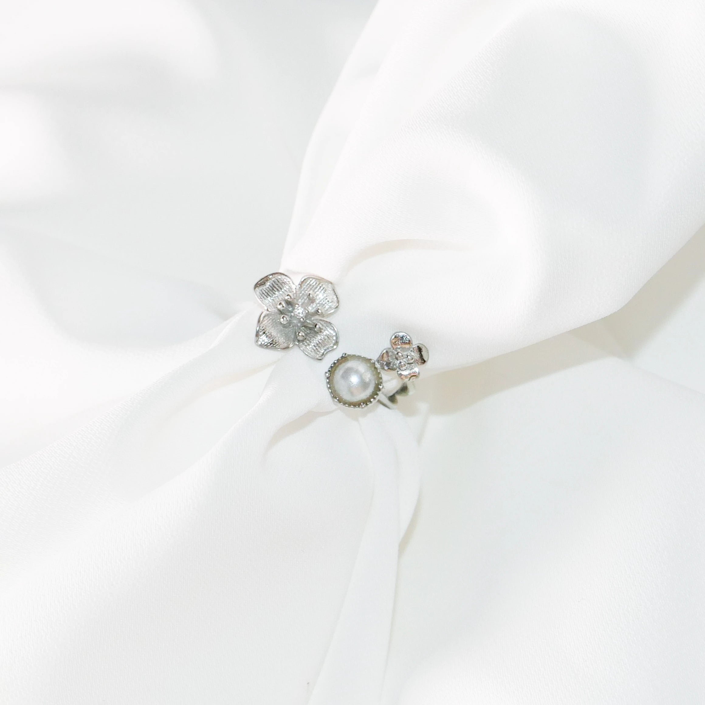 Sterling Silver Flower Open Ring with Pearl & Crystal – Adjustable
