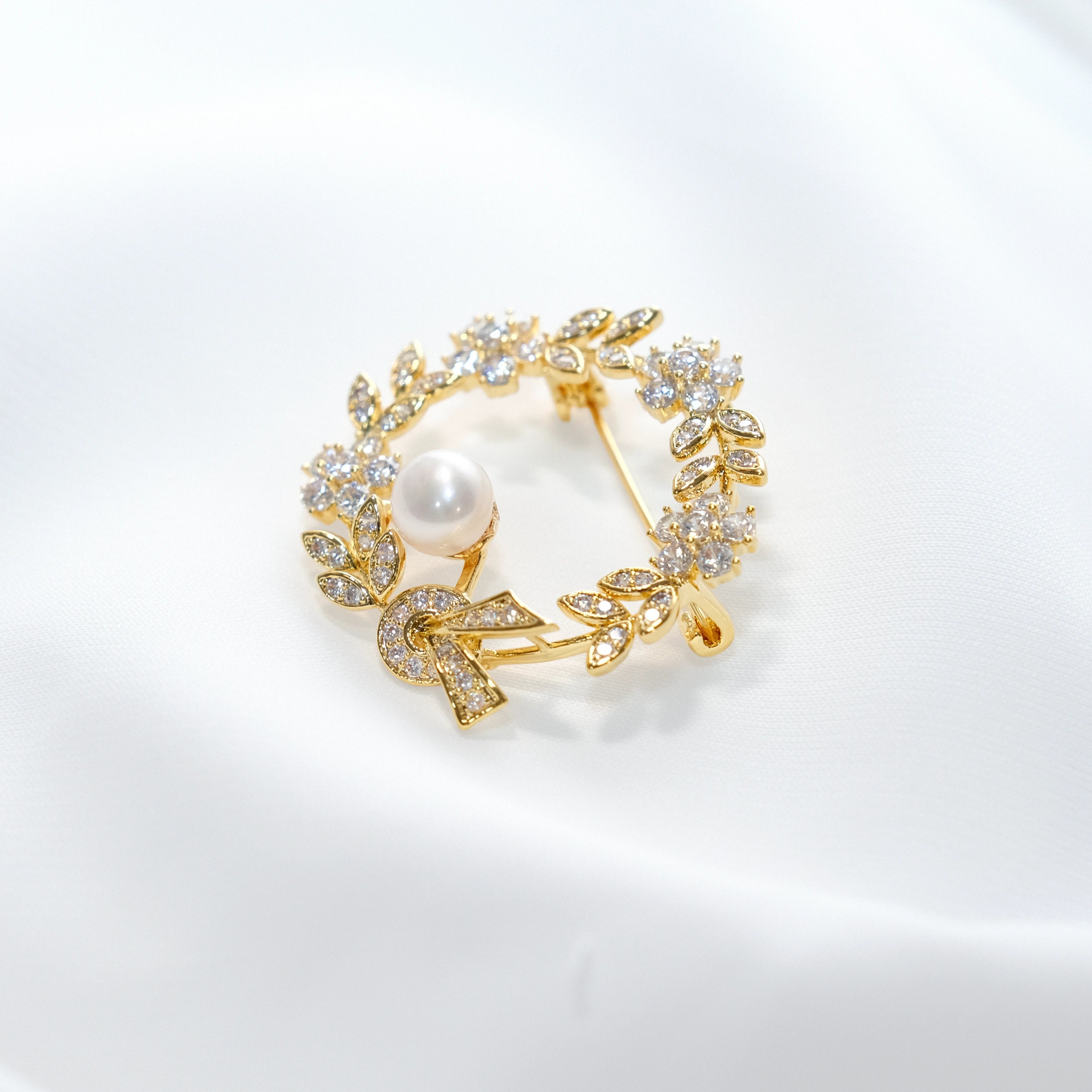 Freshwater Pearl Floral Wreath Brooch with CZ, Gold Tone Pin