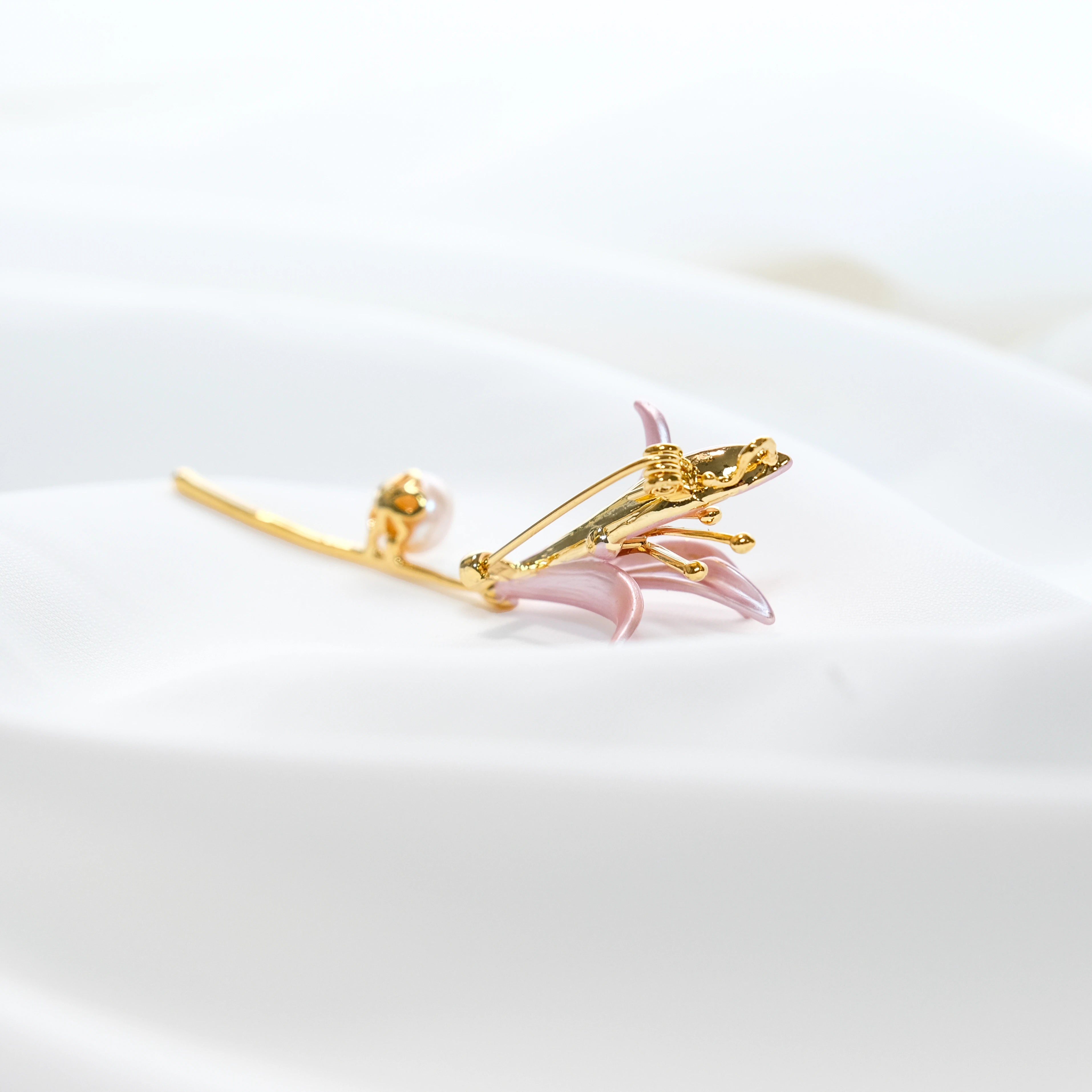 14K Gold Plated Lily Brooch with Freshwater Pearl – Elegant Floral Pin