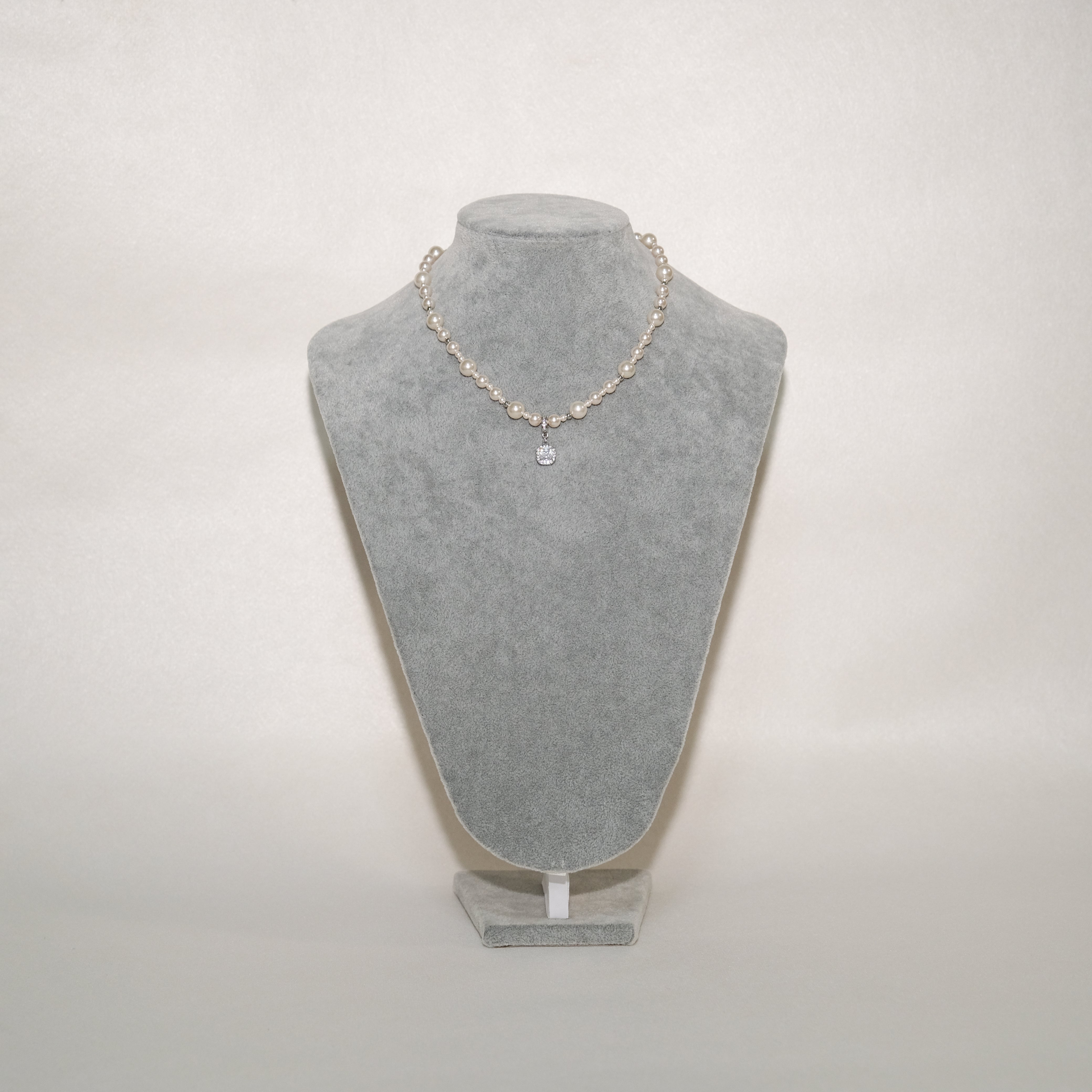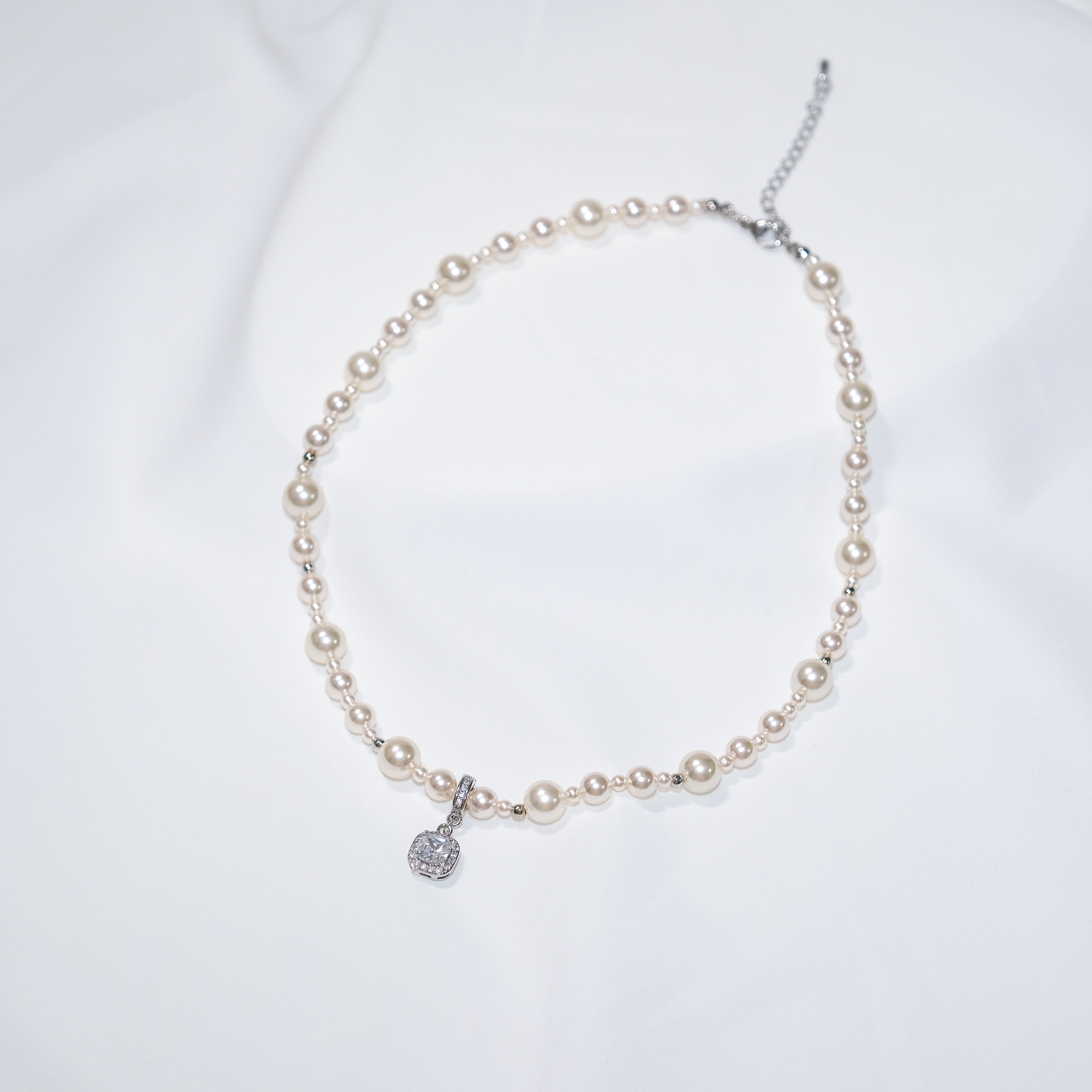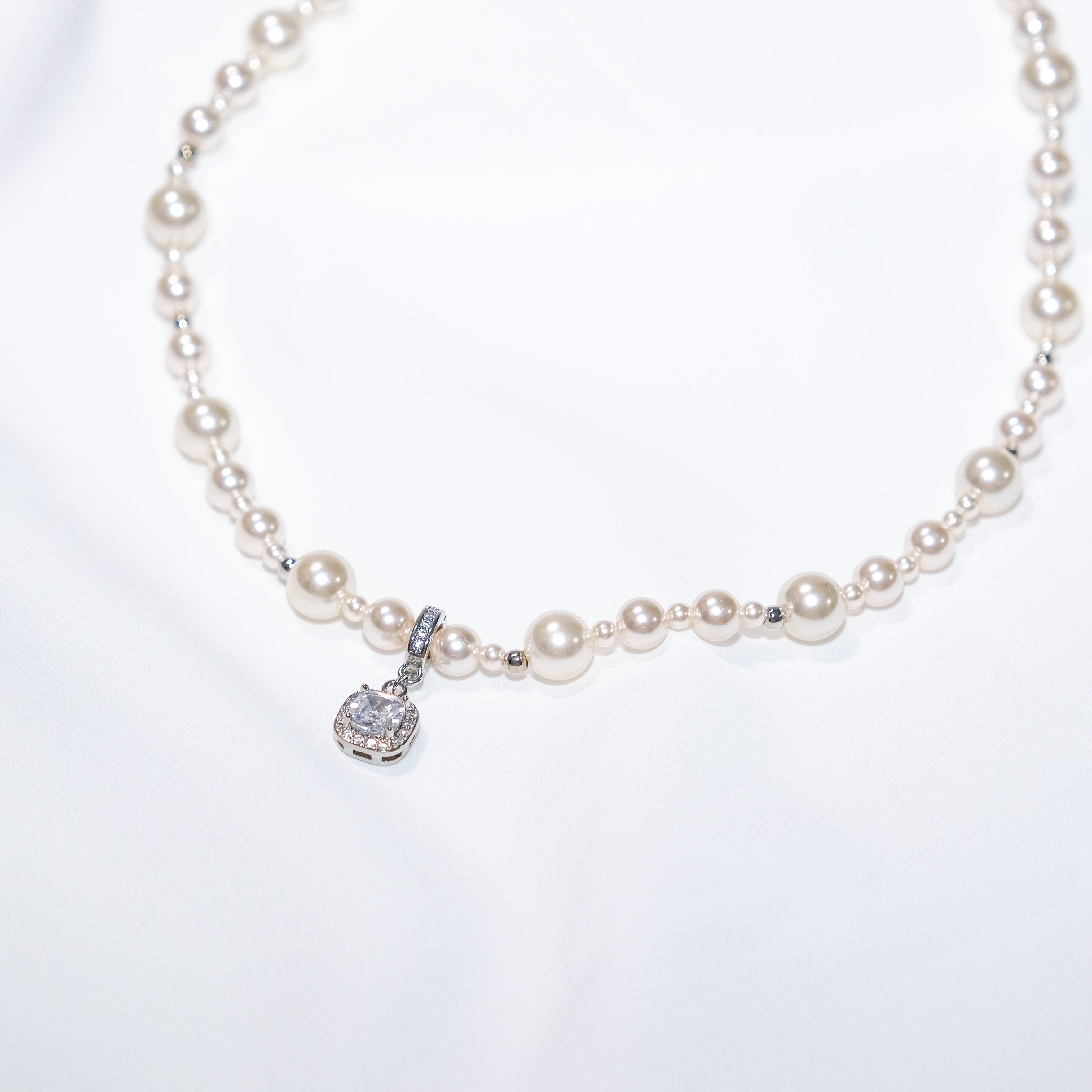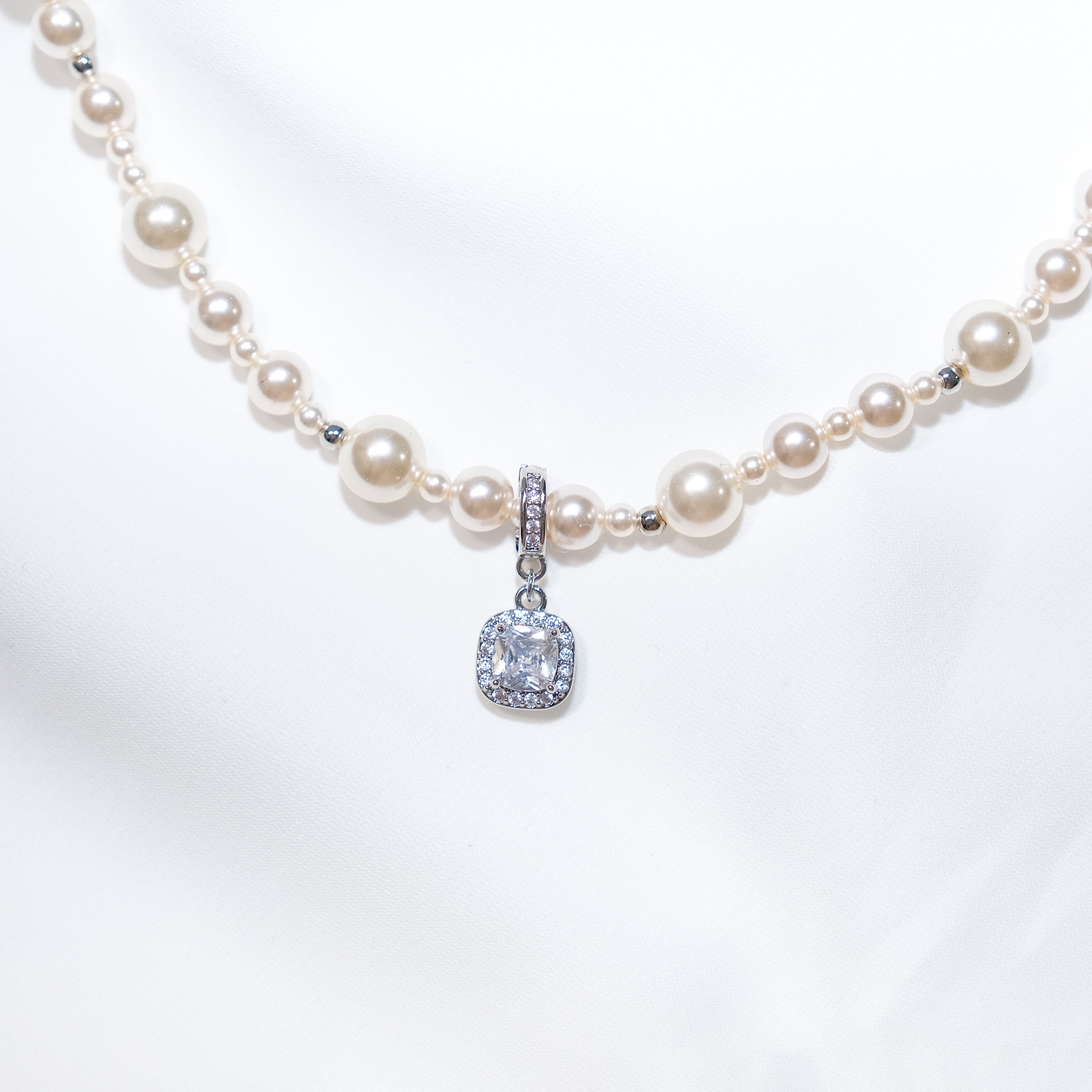 Sterling Silver Pearl Necklace with Detachable Cushion-Cut CZ Pendant