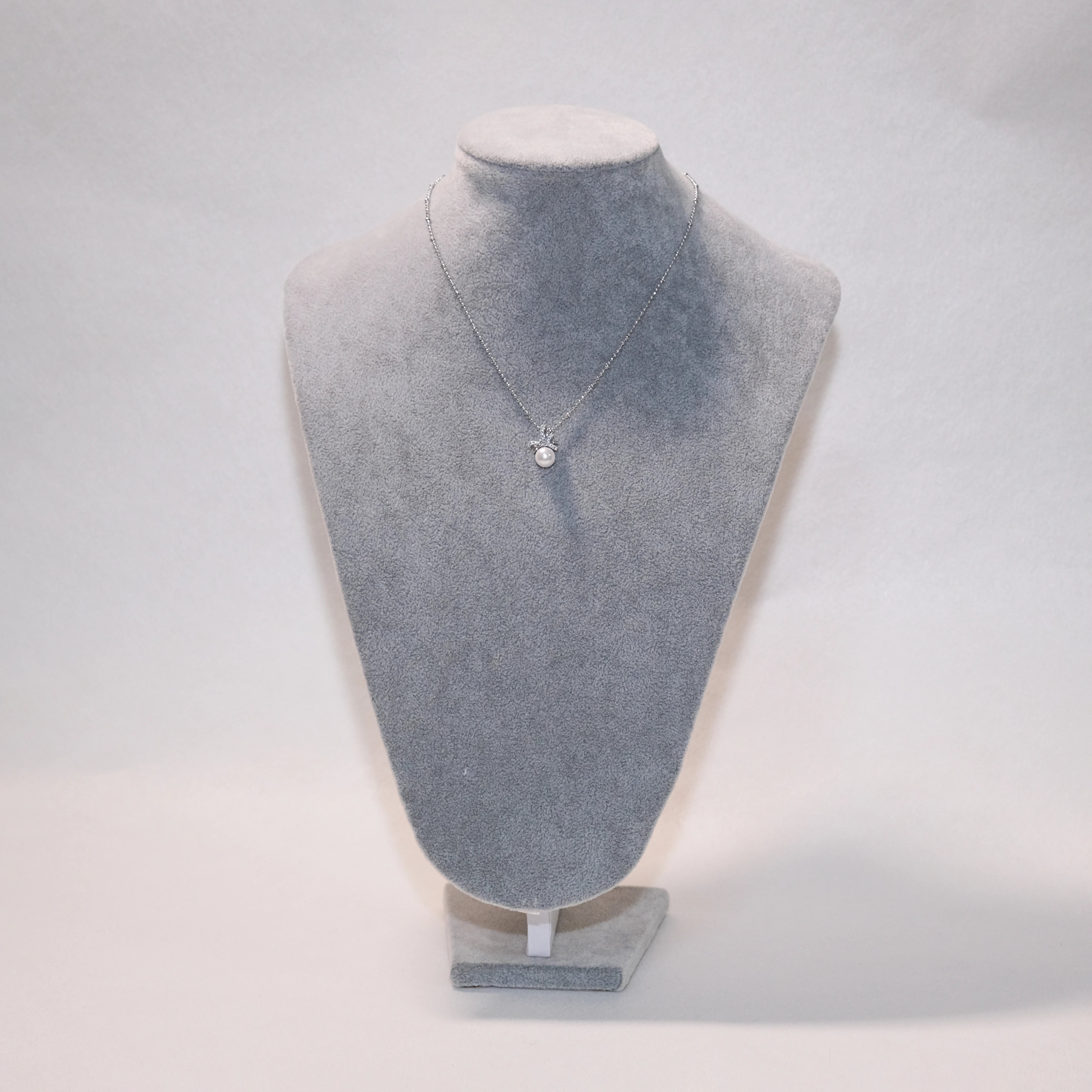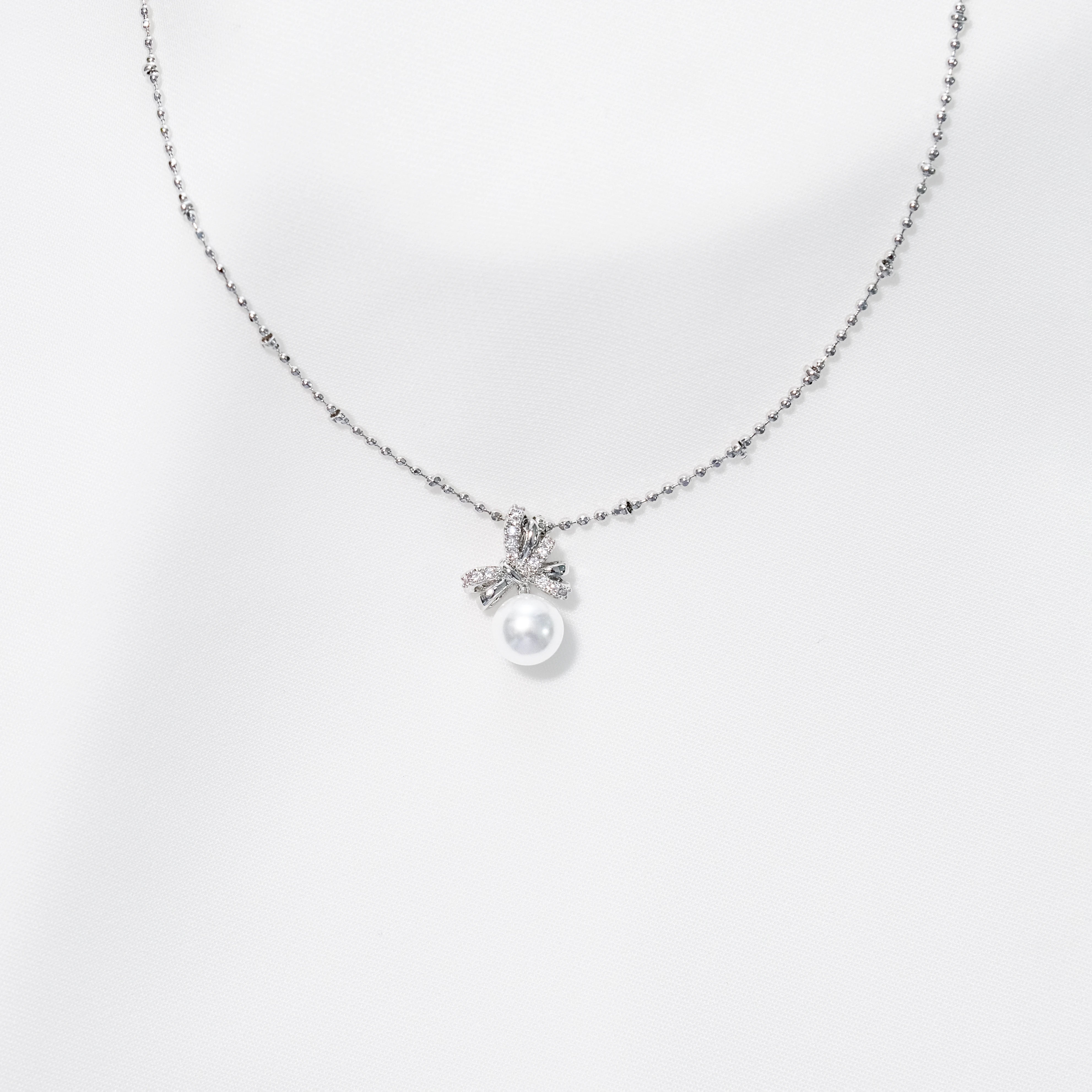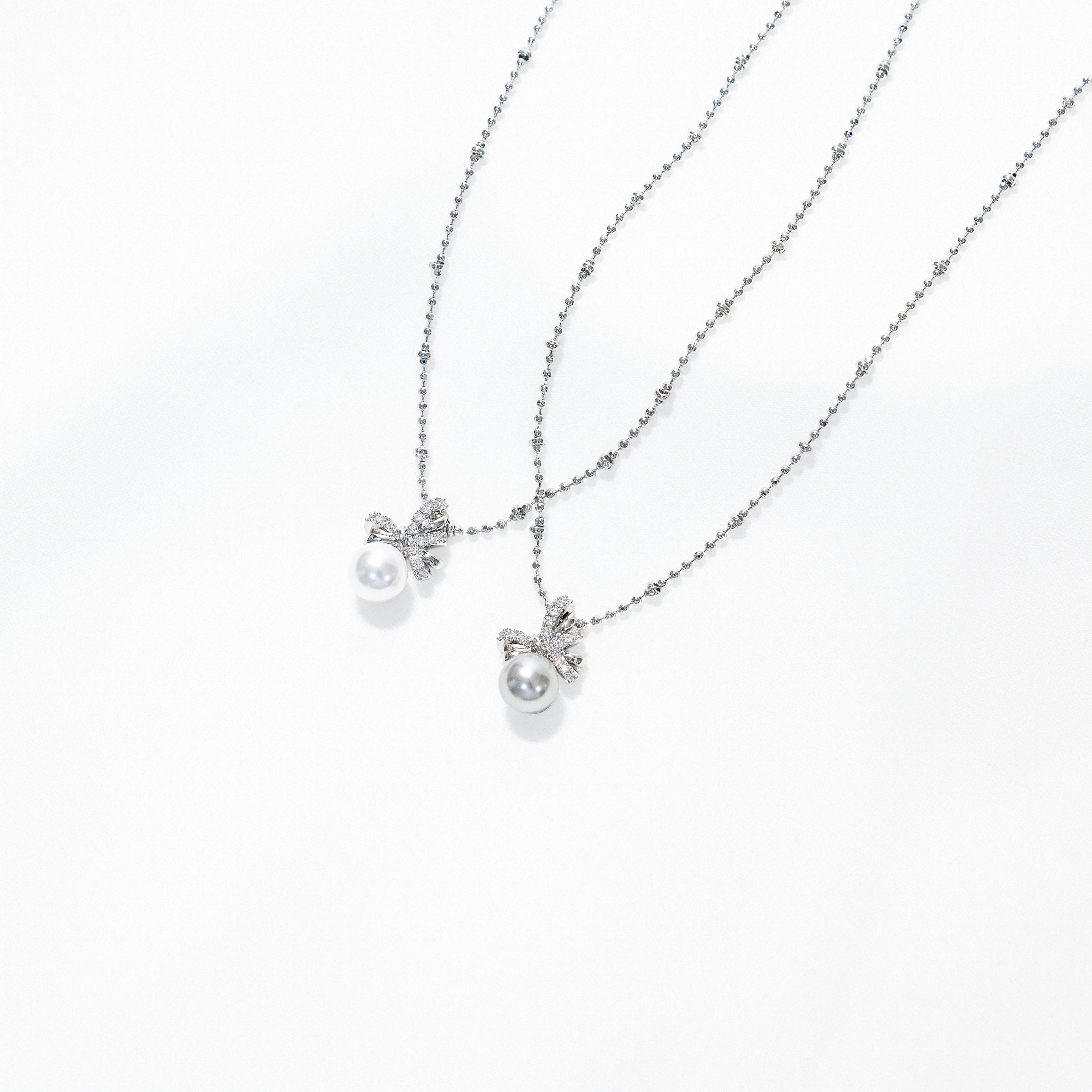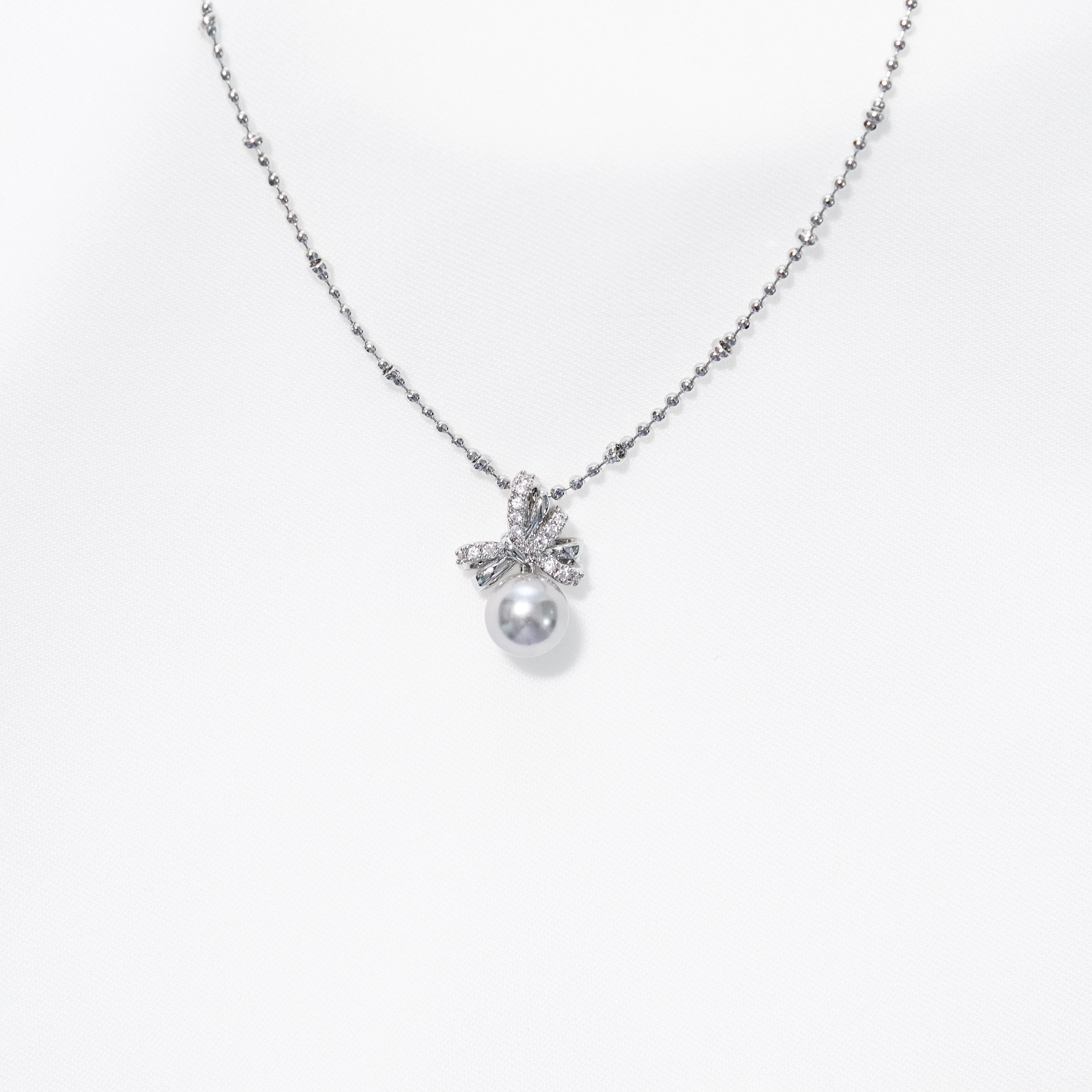 Zircon Bow Pearl Pendant Necklace – White Pearl / Tahitian Gray Pearl