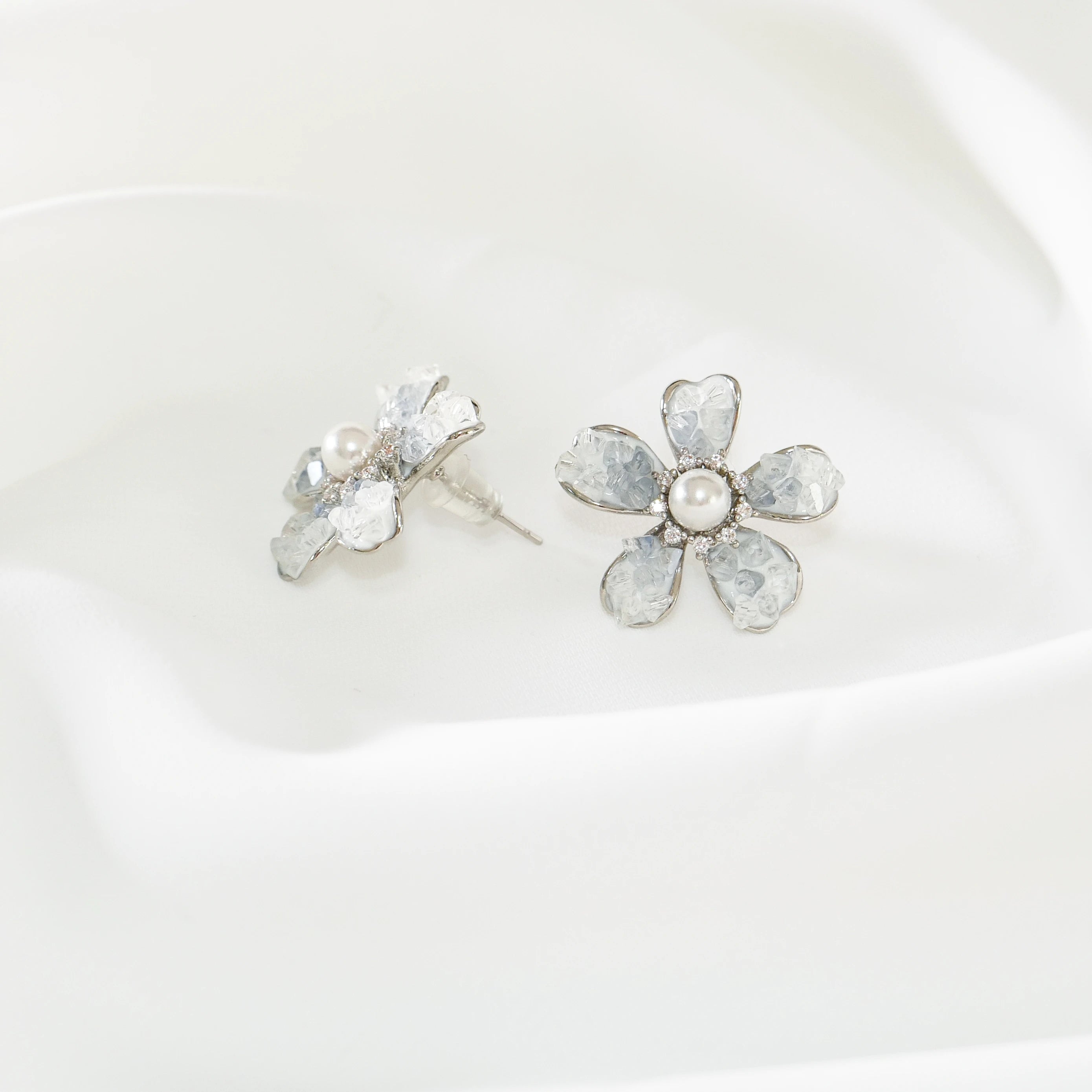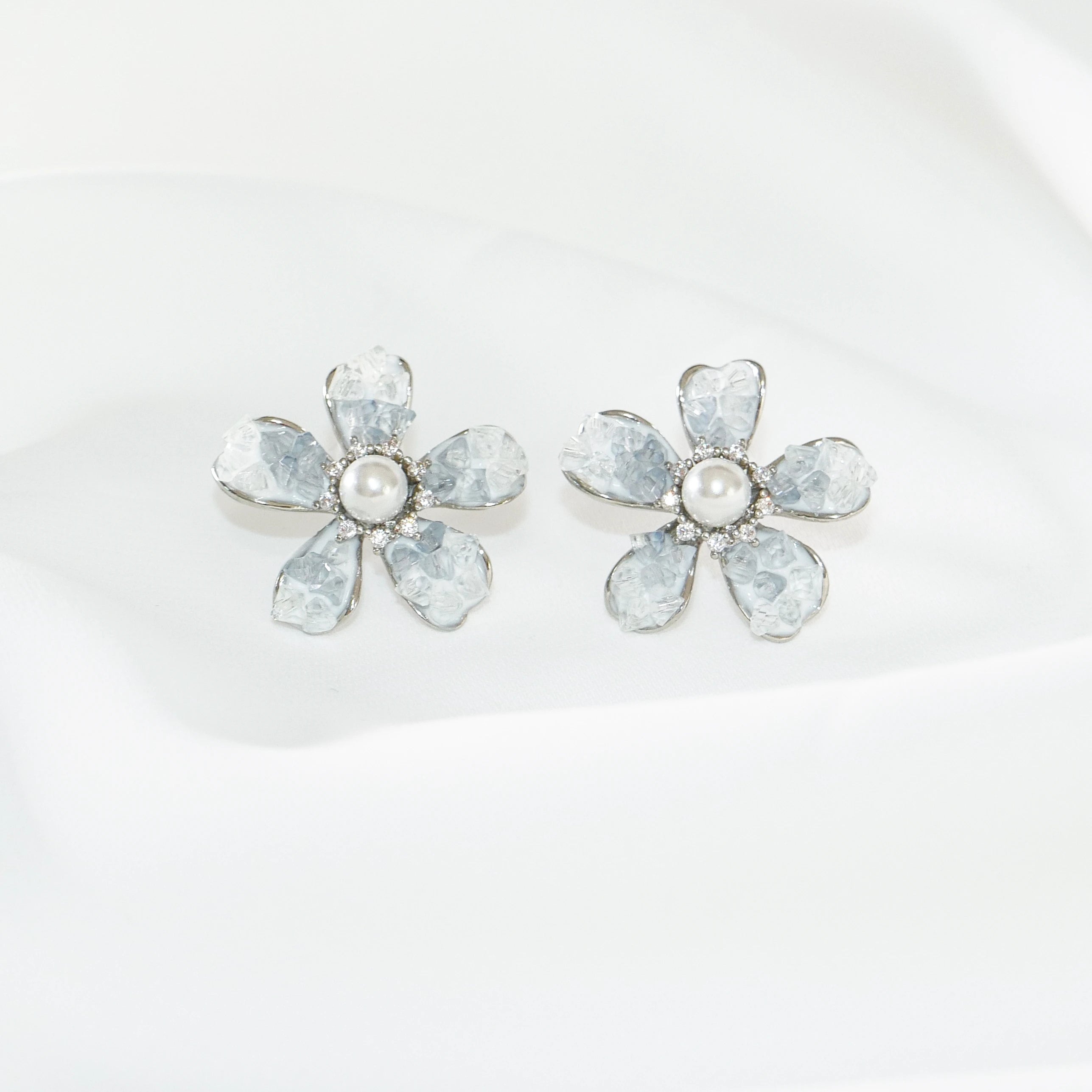 Blue Flower Earrings with Pearl & CZ, S925 Silver Studs