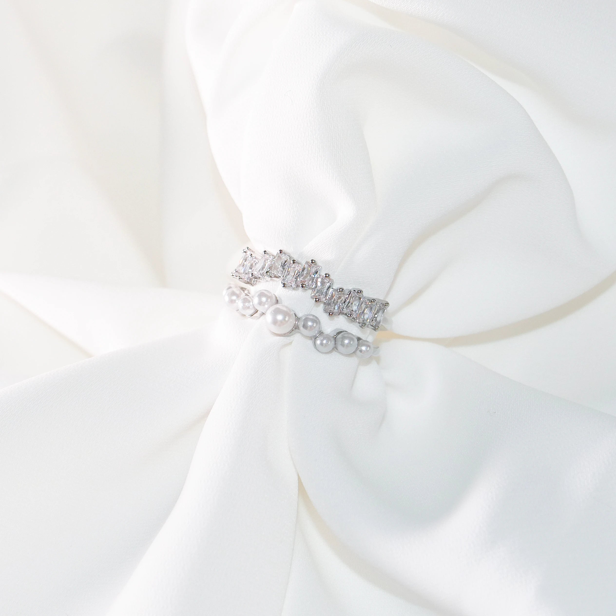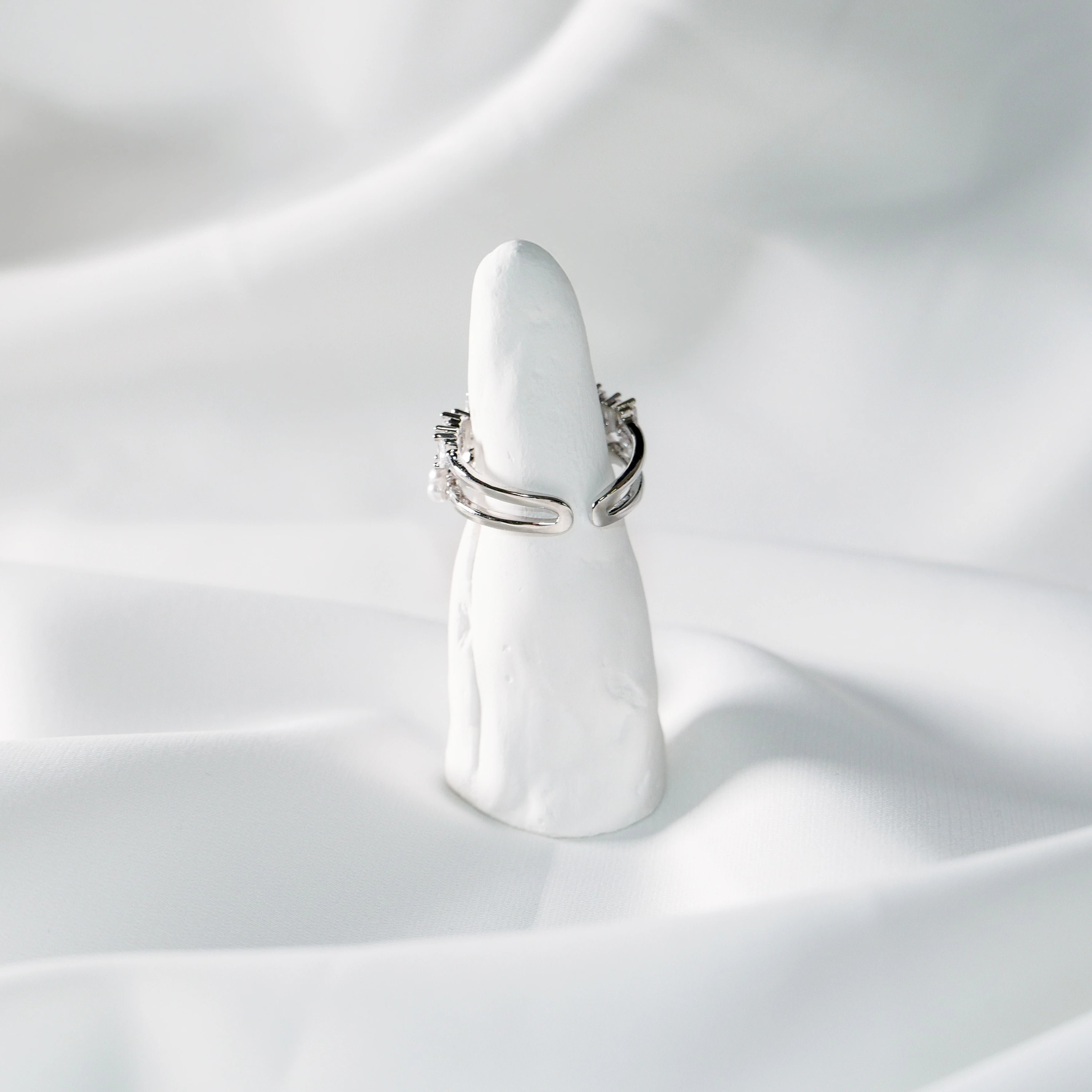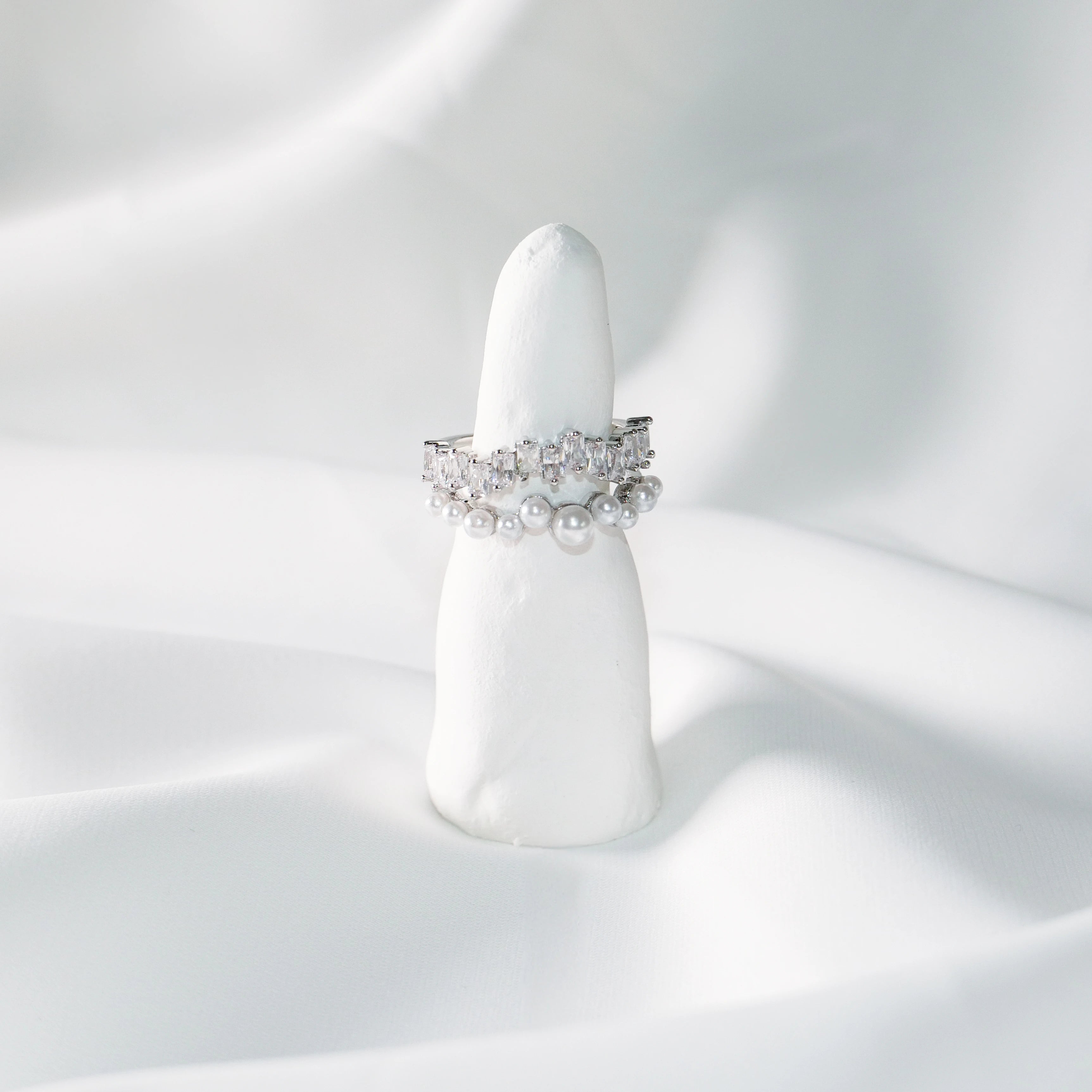Silver Cubic Zirconia & Pearl Double Layer Adjustable Ring
